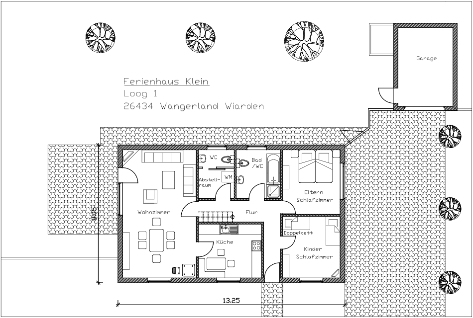 Zum Haus gehört ein gepflasterter Garagenvorplatz, der 2 PKW nebeneinander Parkraum bietet. Hinter dem Haus befindet sich ein Garten mit Terrasse. Für Kinder besteht Spielmöglichkeit auf dem Rasen (Sandkasten und Wippschaukel). Fernsehgeräte mit Kabelanschluss und Waschmaschine sind vorhanden. Tiere nach Rücksprache grundsätzlich erlaubt.